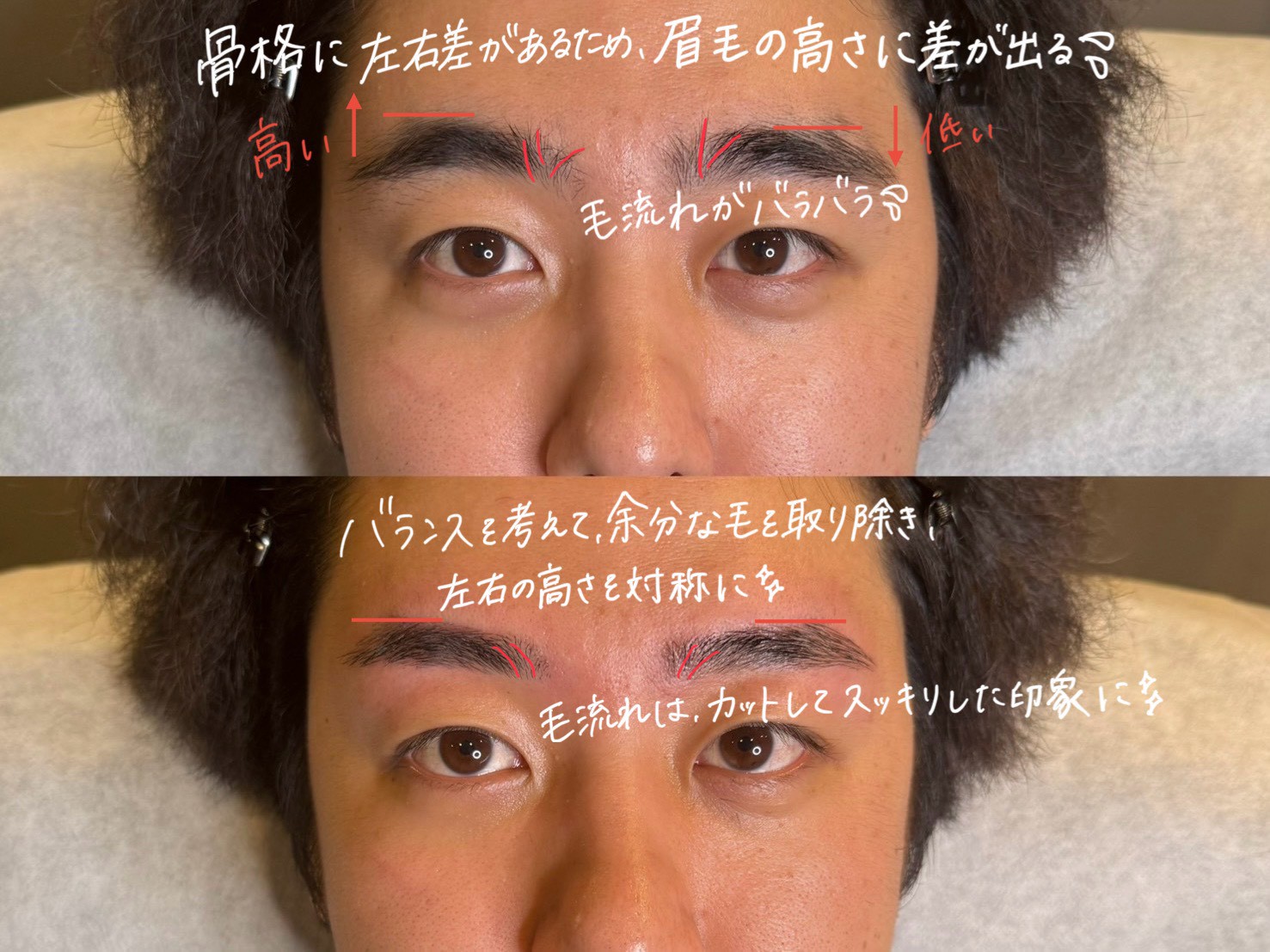 眉毛の太さ、毛流れ、高さが左右対称なので、太さをとりつつ高さが合うようにしました。毛流れはカットで調節し余分なところを取ってあげることでキリっとスッキリした眉毛に整えました。