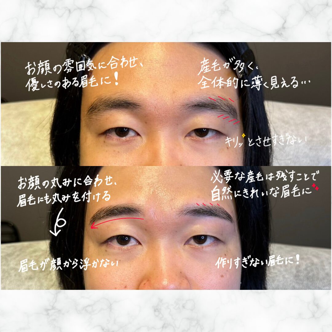 丸くなってる眉山をキリッとさせ、余分な毛でボヤけてる眉毛のラインを直線にする事で男らしい眉に仕上げました。
