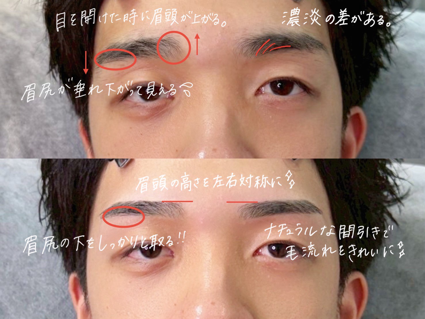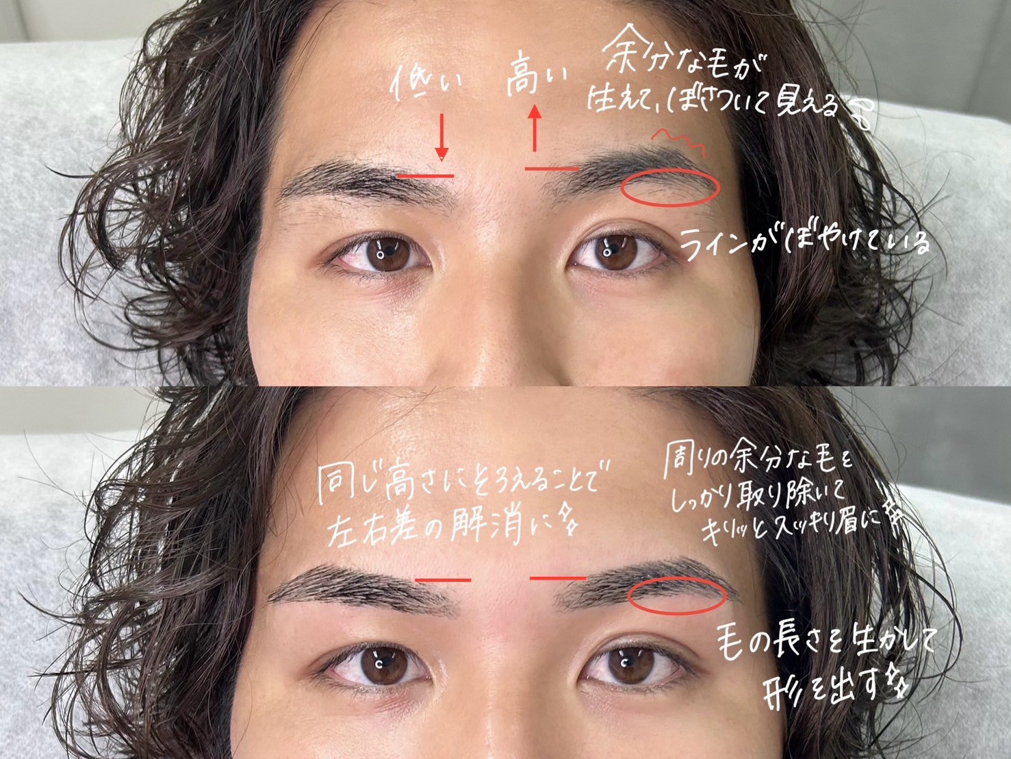 骨格に左右差があるため、眉毛の高さにも左右差がでてしまっていました。毛の長さを利用してカバーしたり、左右対称になるように余分な毛を取り除きました。眉毛のラインを直線にすることで、キリっと男らしいイメージに仕上げました。