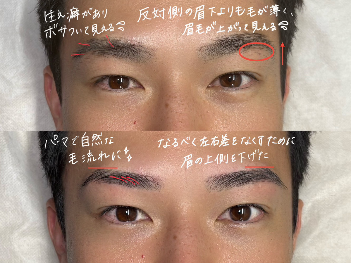 ぼてっとした印象の眉を、キリッと清潔感のある眉にしました。眉毛パーマをすることで、眉毛の濃さを出すことができます。眉頭の印象が弱いので、パーマでしっかりと濃さを出し、眉毛全体が綺麗に見えるように仕上げました。