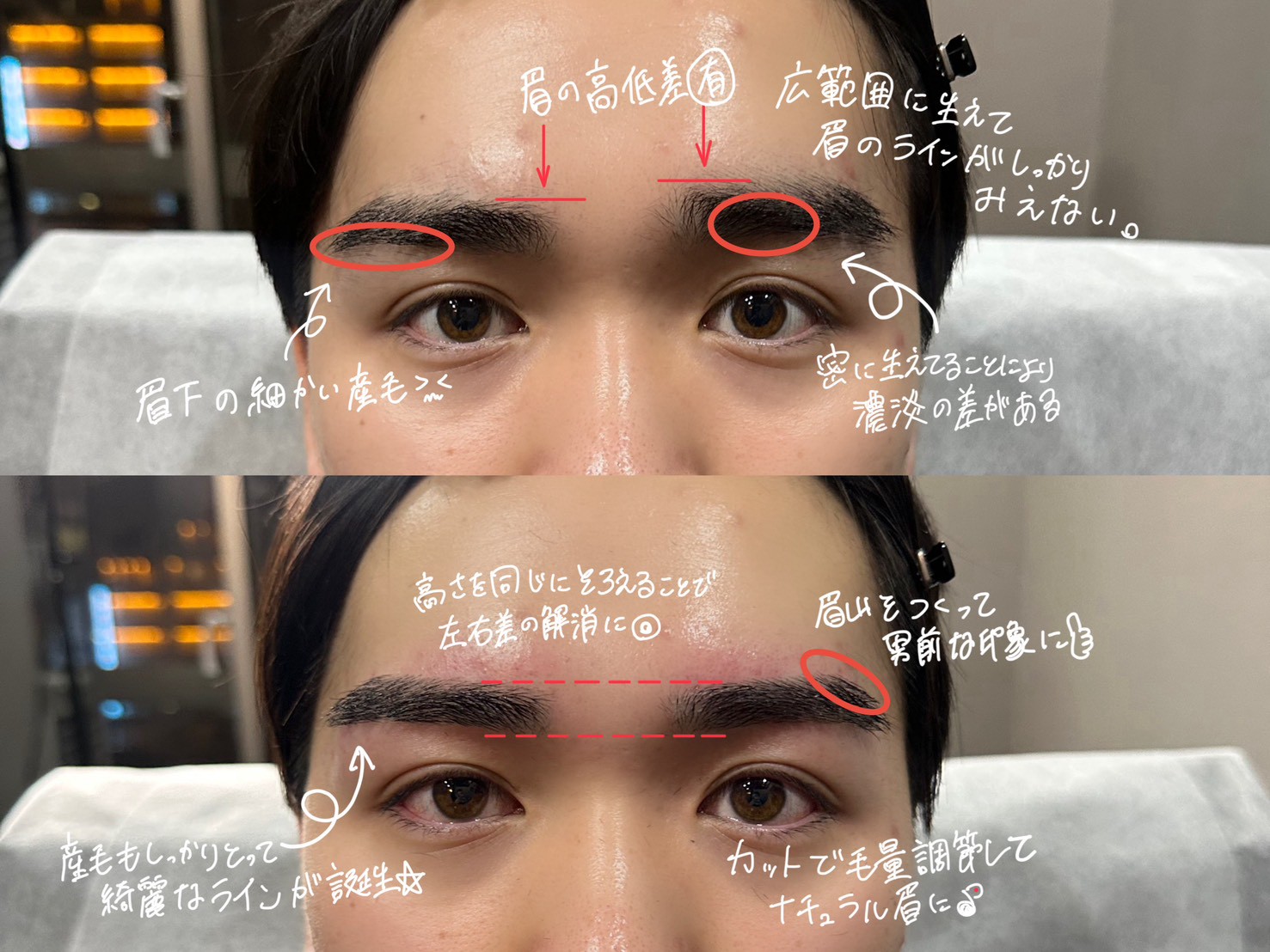 濃淡があった眉毛をカットで軽くし差をなくし、自然に馴染ませました。 -